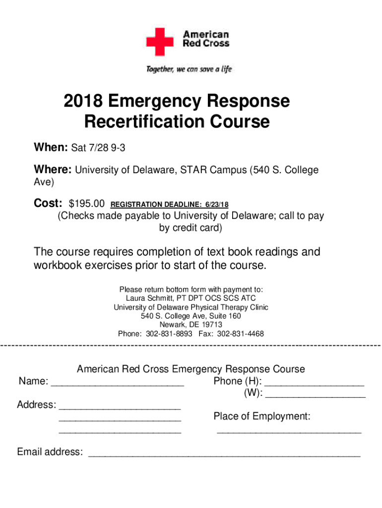 2018 Emergency Response Recertification Course When: Sat 7/28 93 Where: University of Delaware, STAR Campus (540 S. College Ave)Cost: $195.00REGISTRATION DEADLINE: 6/23/18(Checks made payable to University