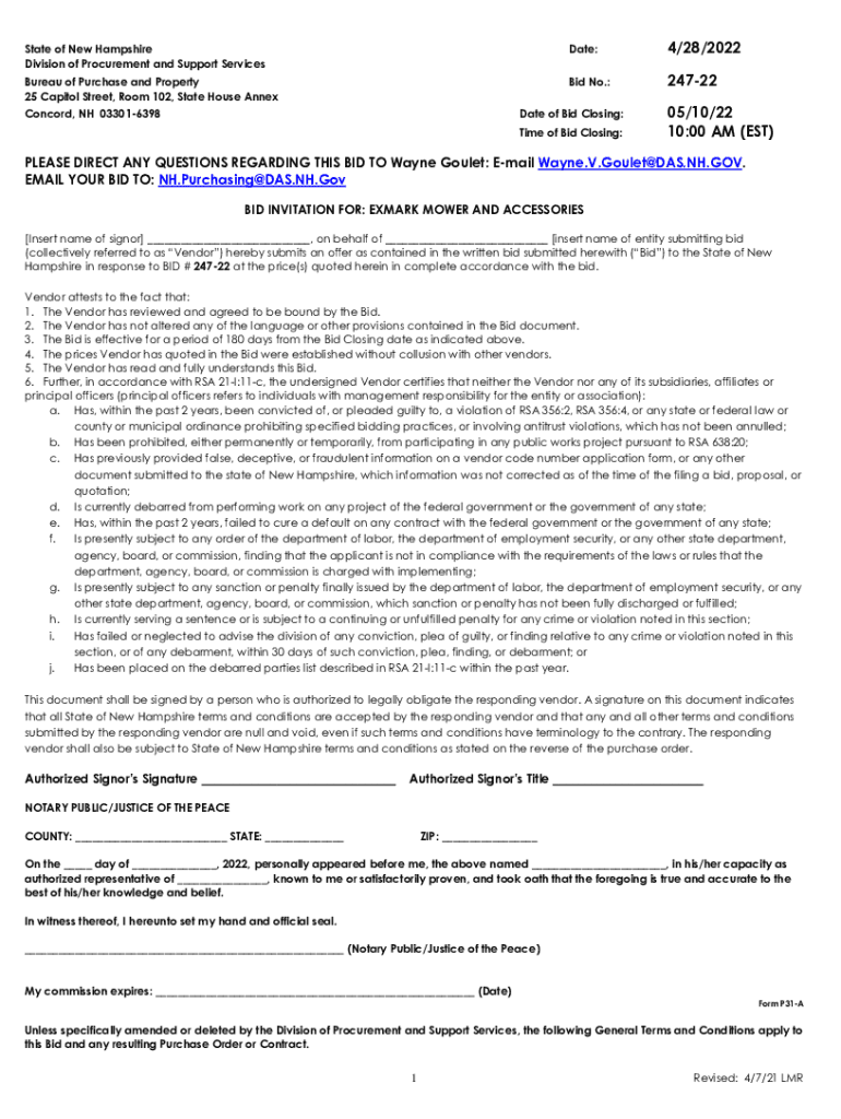 State of New Hampshire Division of Procurement and Support ServicesDate:4/28/2022Bureau of Purchase and Property 25 Capitol Street, Room 102, State House Annexed No.:24722Concord, NH 033016398Date