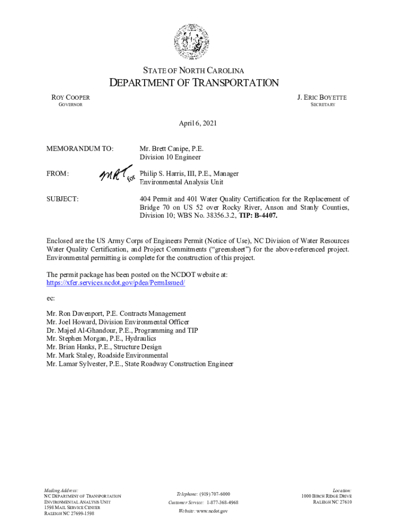 STATE OF NORTH CAROLINADEPARTMENT OF TRANSPORTATION ROY COOPER. ERIC BOYETTEGOVERNORSECRETARYApril 6, 2021 MEMORANDUM TO:Mr. Brett Canine, P.E. Division 10 EngineerFROM:Philip S. Harris, III, P.E.,