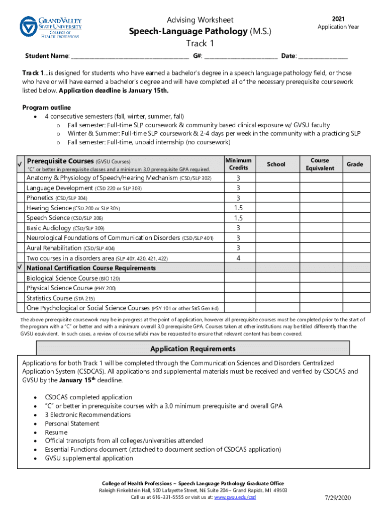 Advising WorksheetSpeechLanguage Pathology (M.S.) Track 12021 Application YearStudent Name: ___ G#: ___ Date: ___ Track 1is designed for students who have earned a bachelors degree in a speech language