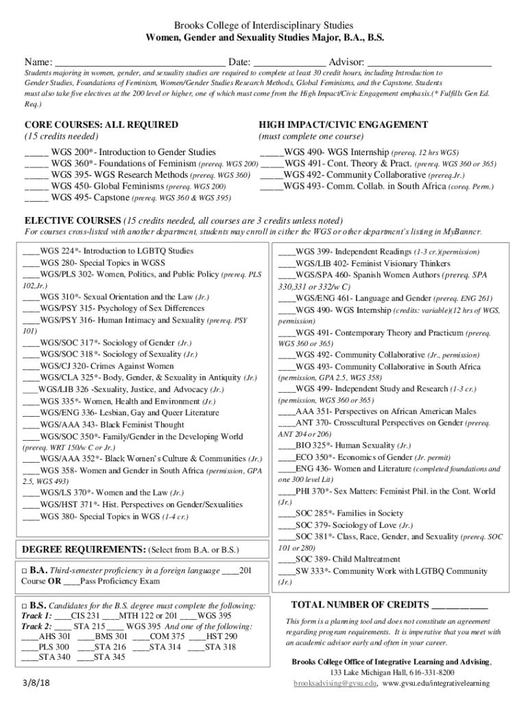 Brooks College of Interdisciplinary Studies Women, Gender and Sexuality Studies Major, B.A., B.S. Name: ___ Date: ___ Advisor: ___ Students majoring in women, gender, and sexuality studies are required