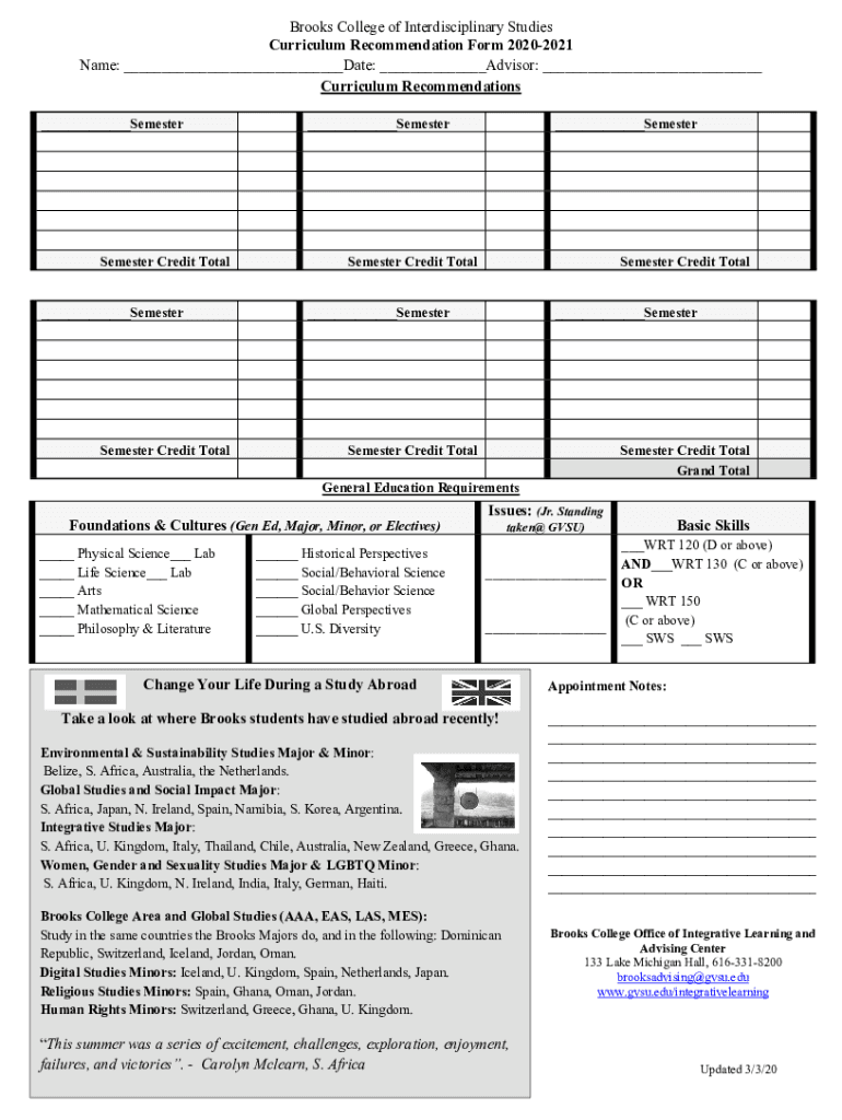 Brooks College of Interdisciplinary Studies Curriculum Recommendation Form 20202021 Name: ___Date: ___Advisor: ___ Curriculum Recommendations ___SemesterSemester Credit Total ___SemesterSemester Credit