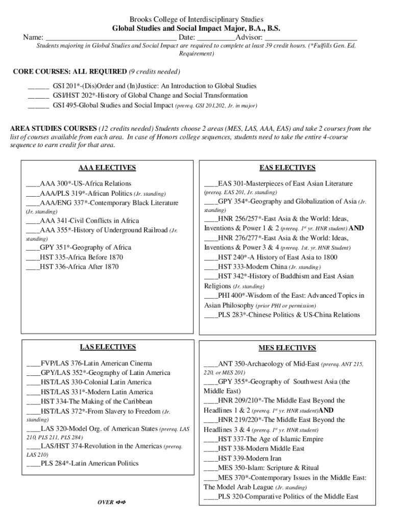 Brooks College of Interdisciplinary Studies Global Studies and Social Impact Major, B.A., B.S. Name: ___ Date: ___Advisor: ___ Students majoring in Global Studies and Social Impact are required to