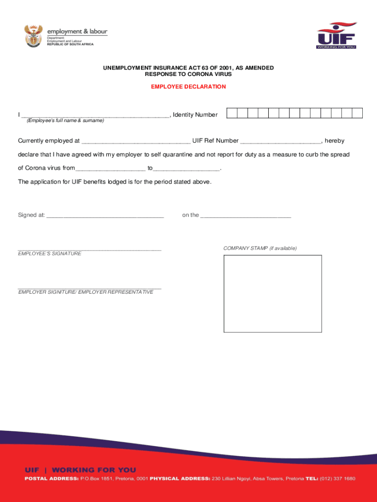 UNEMPLOYMENT INSURANCE ACT 63 OF 2001, AS AMENDED RESPONSE TO CORONAvirus EMPLOYEE DECLARATION ___, Identity Number (Employees full name & surname)Currently employed at ___ IF Ref Number ___, hereby