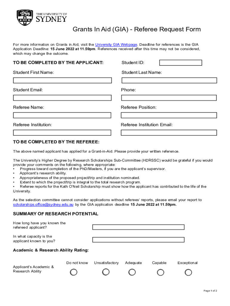 Grants In Aid (GIA) Referee Request Form For more information on Grants in Aid, visit the University GIA Webpage. Deadline for references is the GIA Application Deadline: 15 June 2022 at 11.59pm.