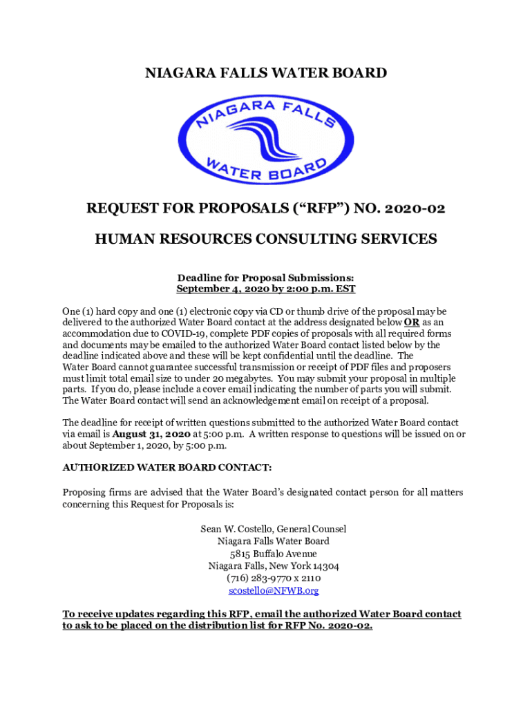 NIAGARA FALLS WATER BOARDREQUEST FOR PROPOSALS (RFP) NO. 202002 HUMAN RESOURCES CONSULTING SERVICES Deadline for Proposal Submissions: September 4, 2020, by 2:00 p.m. EST One (1) hard copy and one