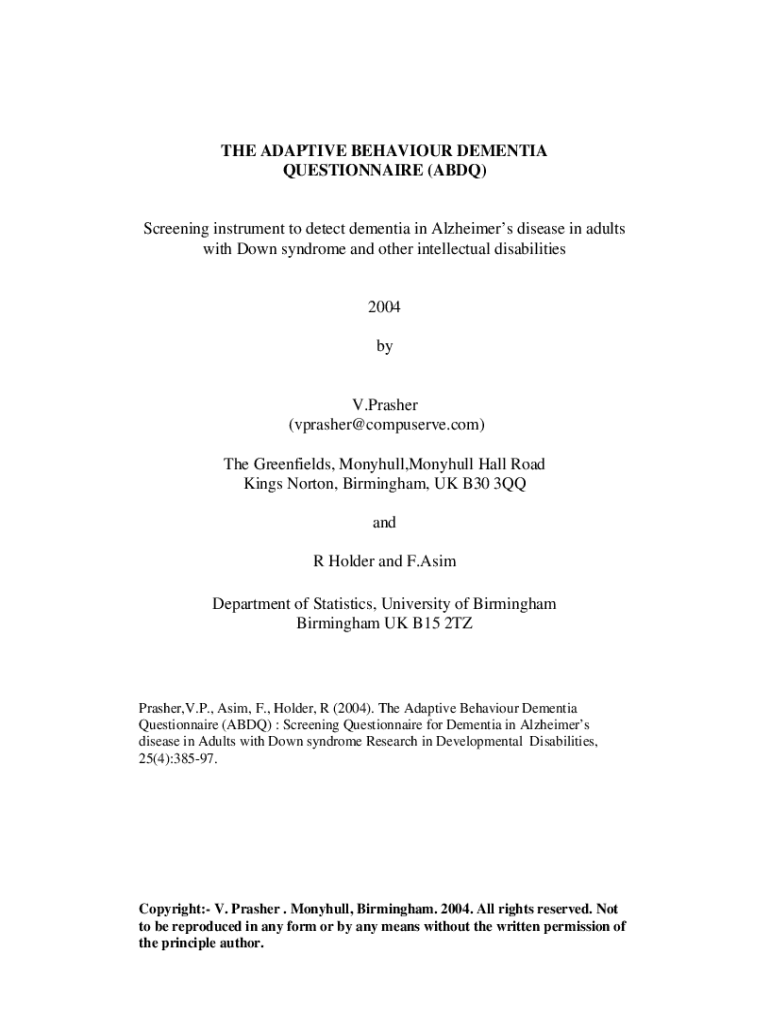 THE ADAPTIVE Behavior DEMENTIA QUESTIONNAIRE (ABD)Screening instrument to detect dementia in Alzheimer's disease in adults with Down syndrome and other intellectual disabilities2004 BYV. Brasher (vprasher@compuserve.com)