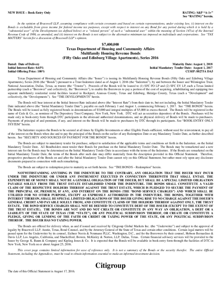 NEW ISSUE Coventry Operating: S&P A1+ See RATING herein. In the opinion of Brace well LLP, assuming compliance with certain covenants and based on certain representations, under existing law, (i)