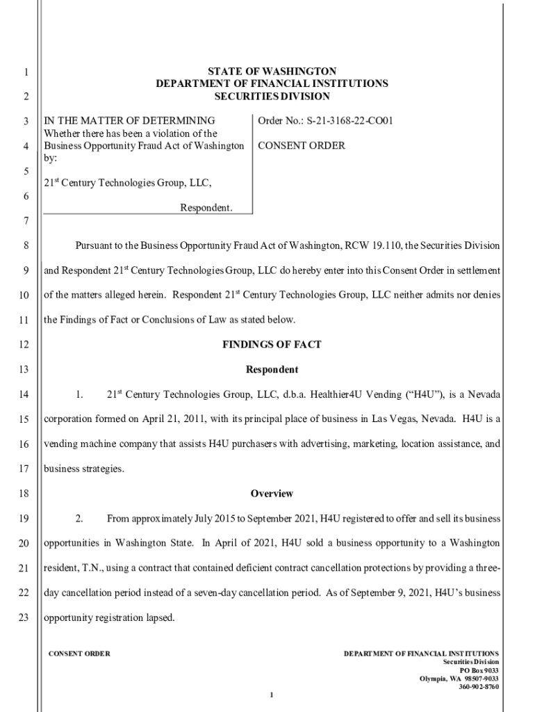 Get the free 21st Century Technologies Group, LLC d/b/a Healthier4U Vending. - Consent Order - S-...