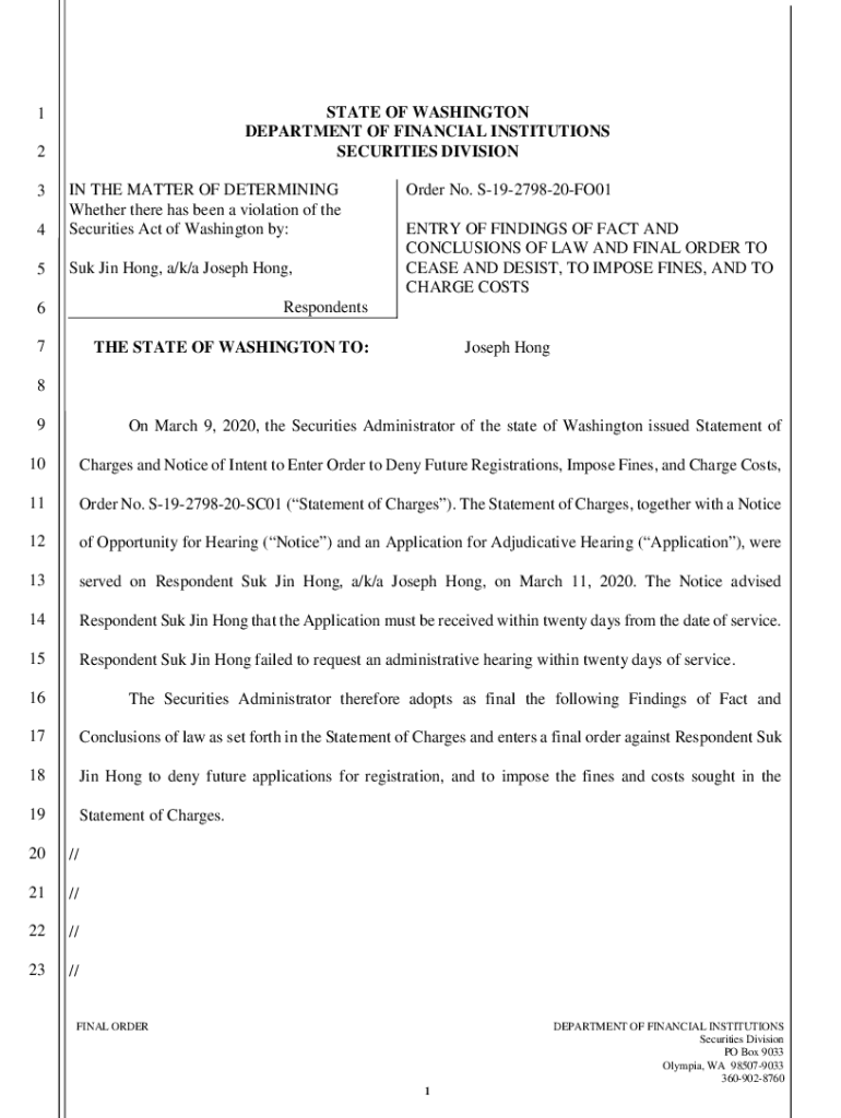 STATE OF WASHINGTON DEPARTMENT OF FINANCIAL INSTITUTIONS SECURITIES DIVISION1 24IN THE MATTER OF DETERMINING Whether there has been a violation of the Securities Act of Washington by:5Suk Jin Hong,