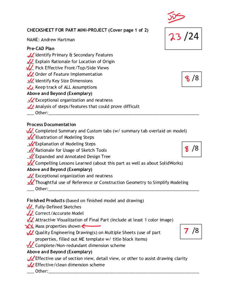 CHECKSHEET FOR PART MINIPROJECT (Cover page 1 of 2) NAME: Andrew Hartman/24PreCAD Plan ___ Identify Primary & Secondary Features ___ Explain Rationale for Location of Origin ___ Pick Effective Front/Top/Side