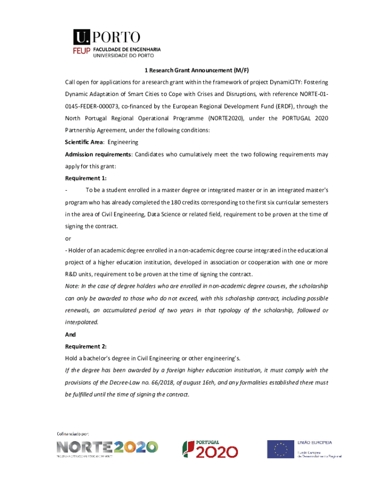 1ResearchGrantAnnouncement(M/F) CallopenforapplicationsforaresearchgrantwithintheframeworkofprojectDynamiCITY:Fostering DynamicAdaptationofSmartCitiestoCopewithCrisesandDisruptions,withreferenceNORTE01