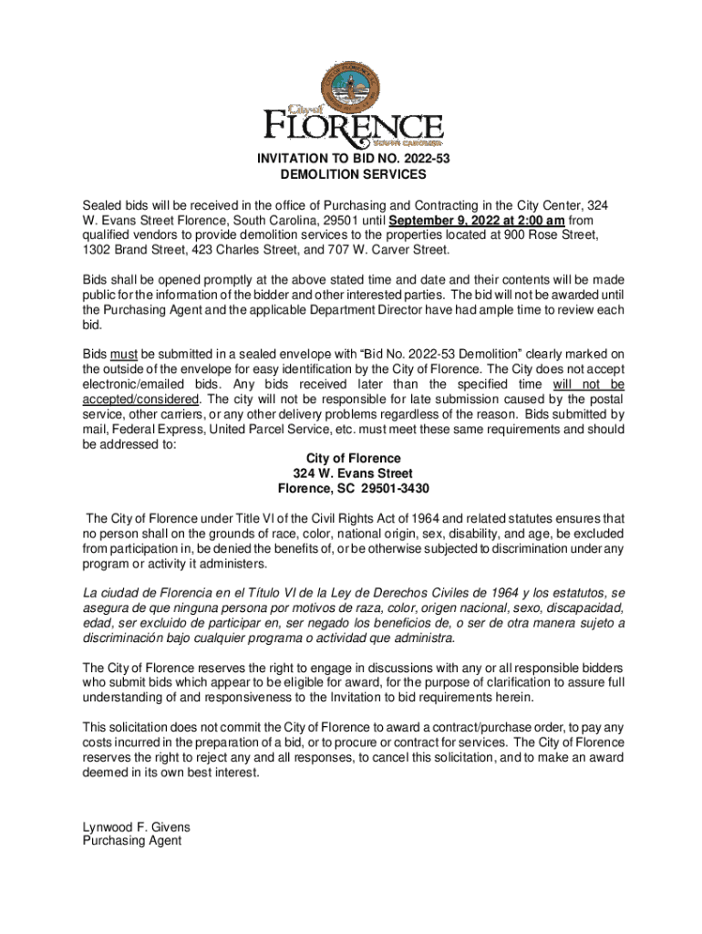 INVITATION TO BID NO. 202253 DEMOLITION SERVICES Sealed bids will be received in the office of Purchasing and Contracting in the City Center, 324 W. Evans Street Florence, South Carolina, 29501 until