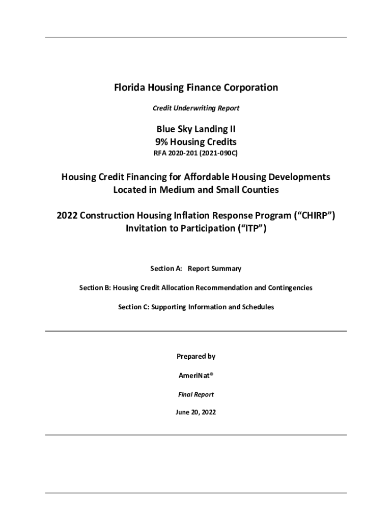 Florida Housing Finance Corporation Credit Underwriting Reportable Sky Landing II 9% Housing Credits RFA 2020201 (2021090C)Housing Credit Financing for Affordable Housing Developments Located in Medium