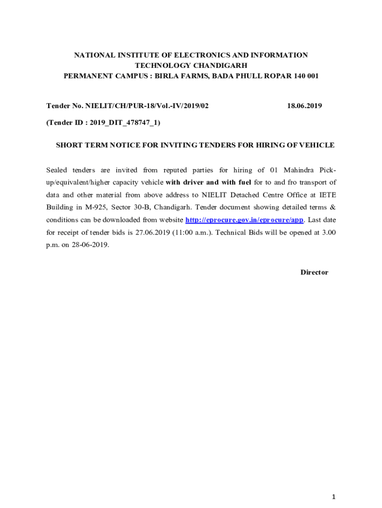 NATIONAL INSTITUTE OF ELECTRONICS AND INFORMATION TECHNOLOGY CHANDIGARH PERMANENT CAMPUS : BIR LA FARMS, BAD PULL ROAR 140 001Tender No. NITWIT/CH/PUR18/Vol.IV/2019/0218.06.2019(Tender ID : 2019_IT_478747_1)