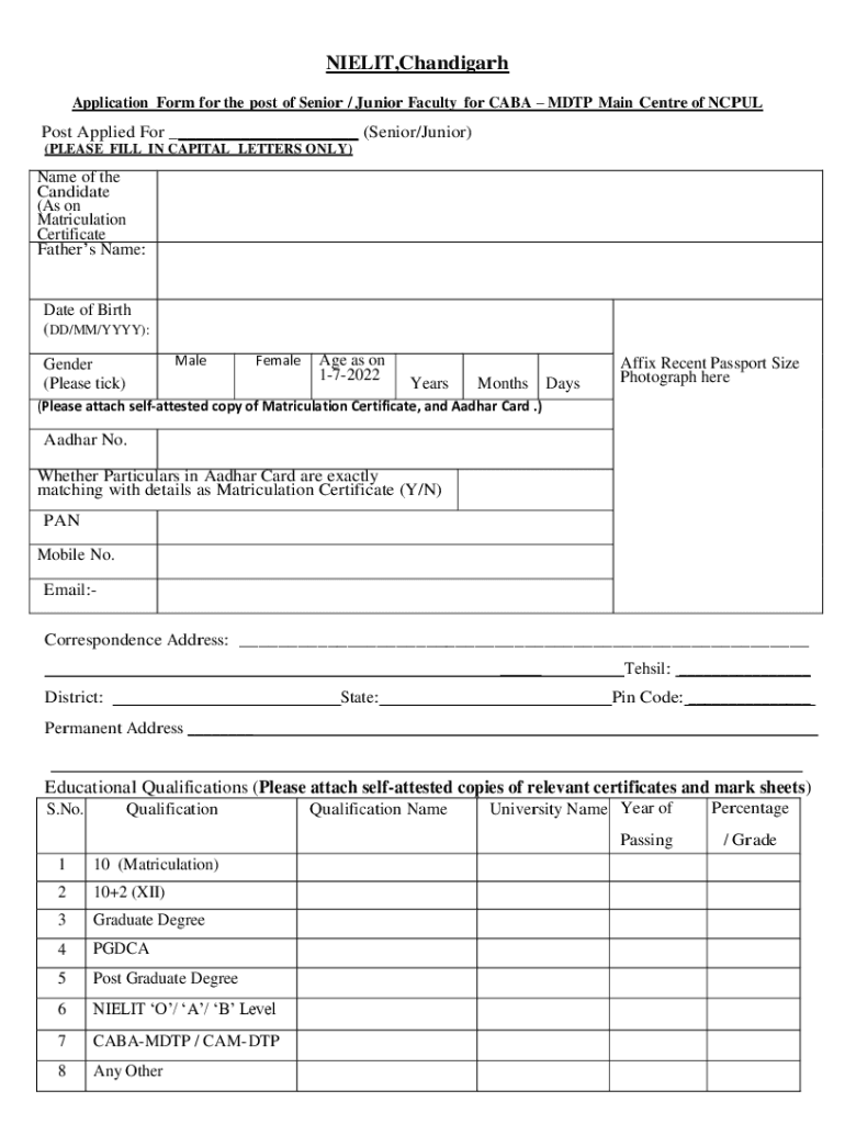NITWIT, Chandigarh Application Form for the post of Senior / Junior Faculty for CUBA DTP Main Center of Pulposi Applied For ___ (Senior/Junior) (PLEASE FILL IN CAPITAL LETTERS ONLY)Name of the Candidate