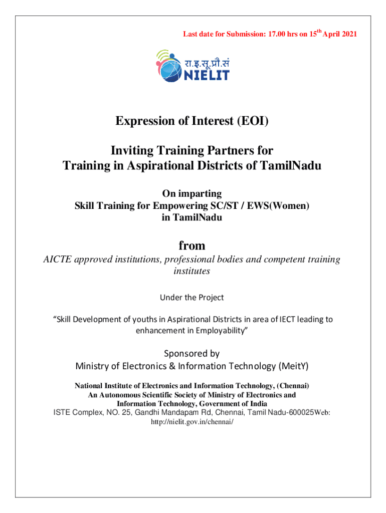 Last date for Submission: 17.00 hrs on 15th April 2021Expression of Interest (EOI) Inviting Training Partners for Training in Aspirational Districts of Tamil Nadu On imparting Skill Training for Empowering