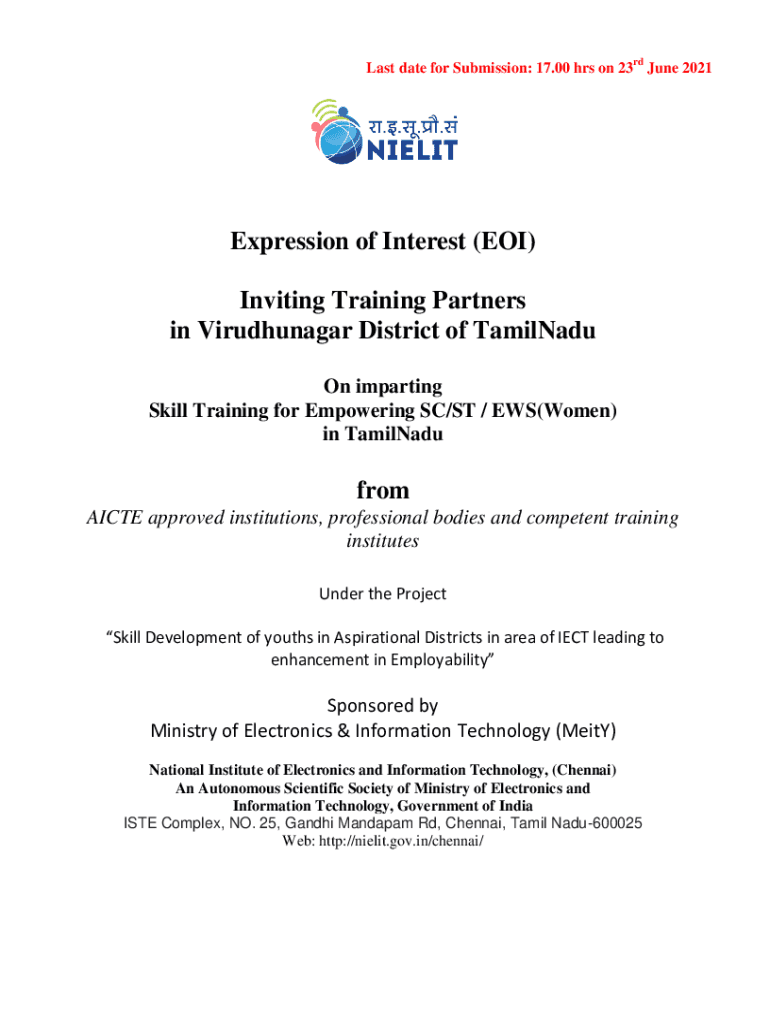 Last date for Submission: 17.00 hrs on 23rd June 2021Expression of Interest (EOI) Inviting Training Partners in Virudhunagar District of Tamil Nadu On imparting Skill Training for Empowering SC/ST