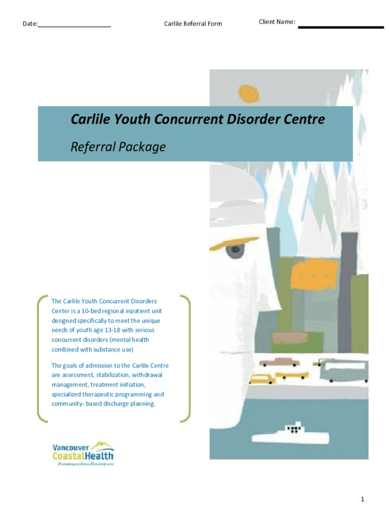 Date:Carlyle Referral Formulaic Name:Carlyle Youth Concurrent Disorder Center Referral Package Carlyle Youth Concurrent Disorders Center is a 10bed regional inpatient unit designed specifically to