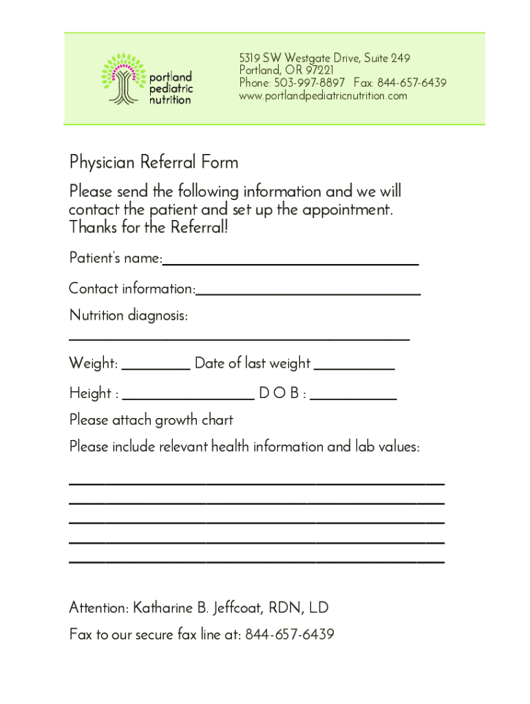 5319 SW West gate Drive, Suite 249 Portland, OR 97221 Phone: 5039978897 Fax: 8446576439 www.portlandpediatricnutrition.comPhysician Referral Form Please send the following information, and we will