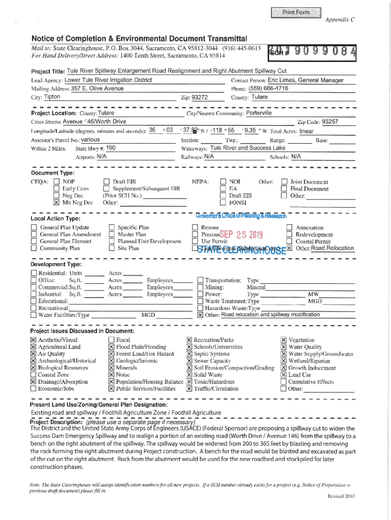 Print FormAppendix Notice of Completion & Environmental Document Transmittal Mail to: State Clearinghouse, P.O. Box 3044, Sacramento, CA 958123044 (916) 4450613 For Hand Delivery/Street Address: 1400