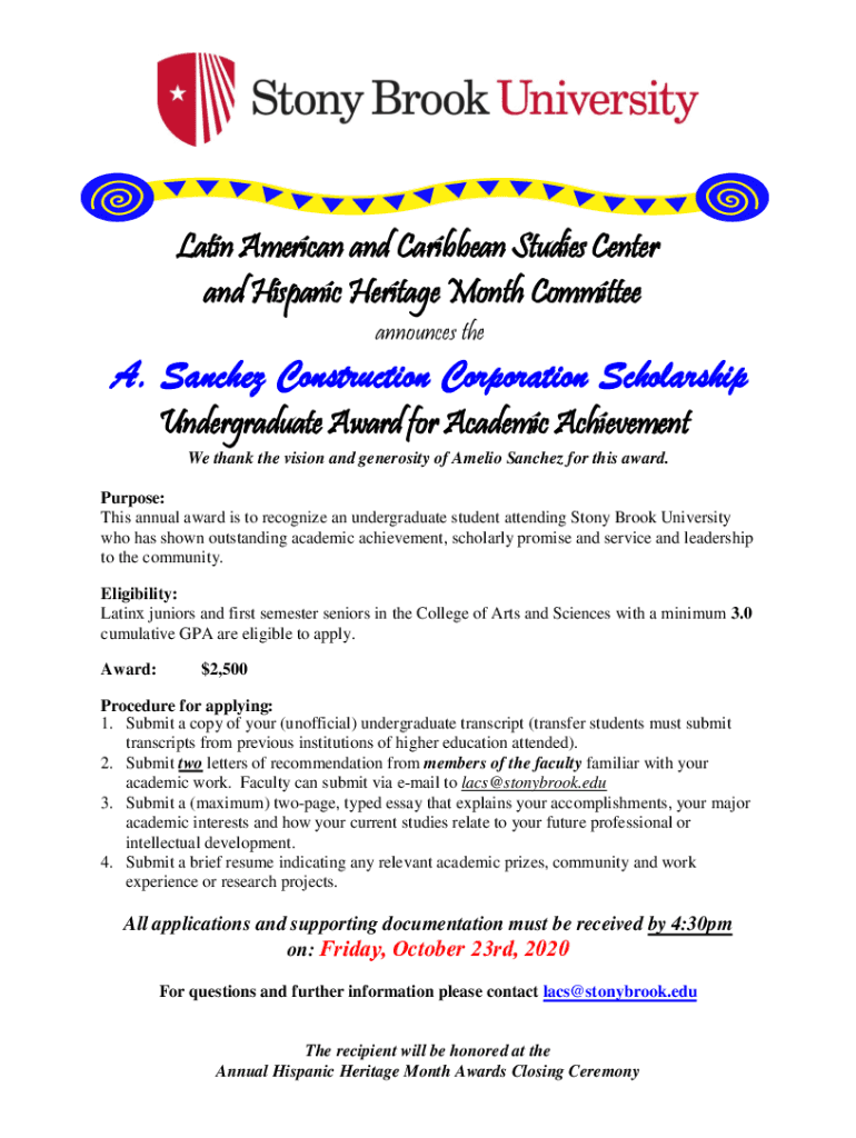 Latin American and Caribbean Studies Center and Hispanic Heritage Month Committee announces Thea. Sanchez Construction Corporation Scholarship Undergraduate Award for Academic Achievement We thank