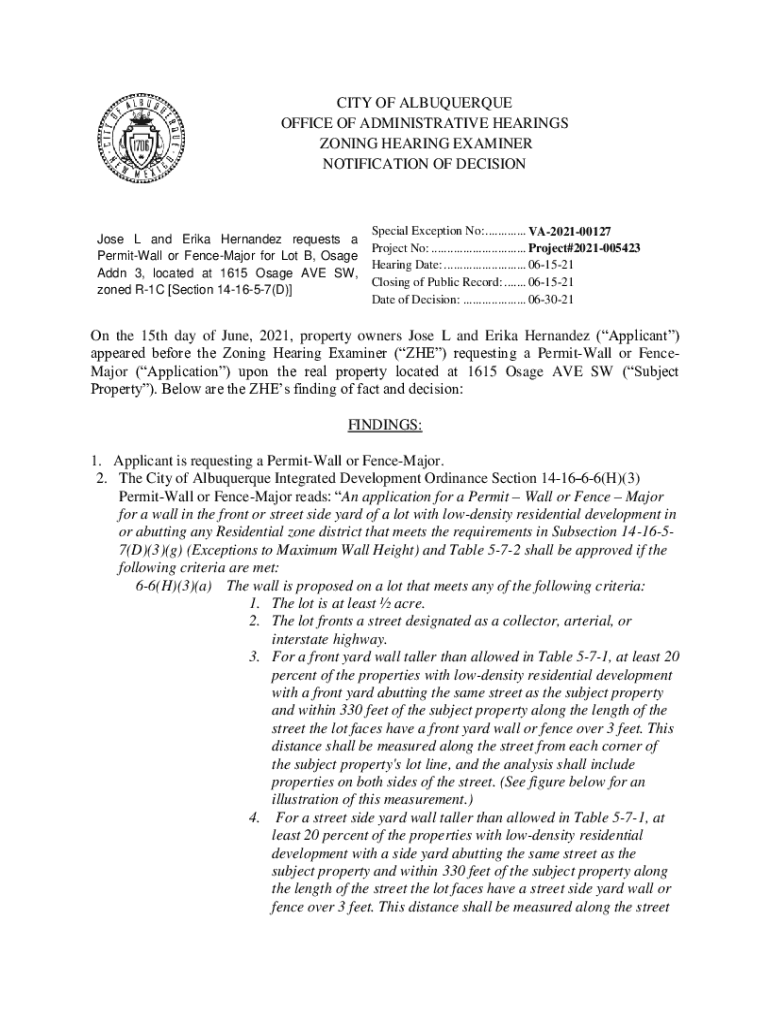 CITY OF ALBUQUERQUE OFFICE OF ADMINISTRATIVE HEARINGS ZONING HEARING EXAMINER NOTIFICATION OF DECISION Jose L and Erika Hernandez requests a Permit Wall or Fence Major for Lot B, Osage Add 3, located