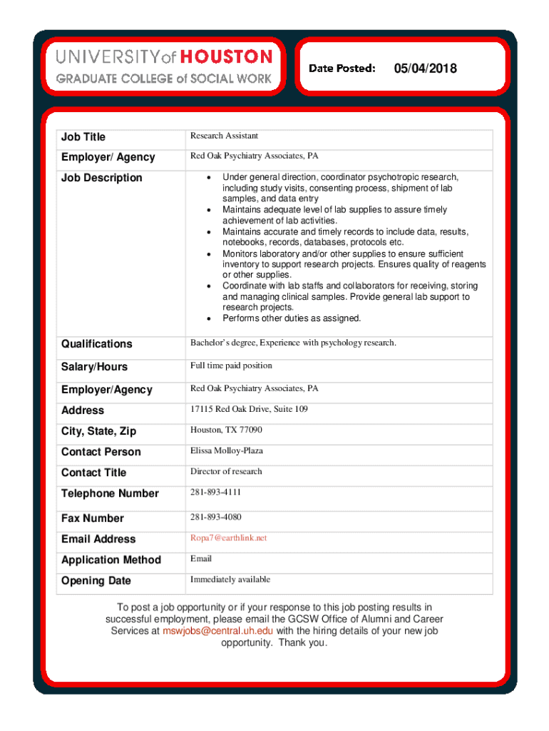 05/04/2018Job TitleResearch AssistantEmployer/ Agency Oak Psychiatry Associates, PA Job Description