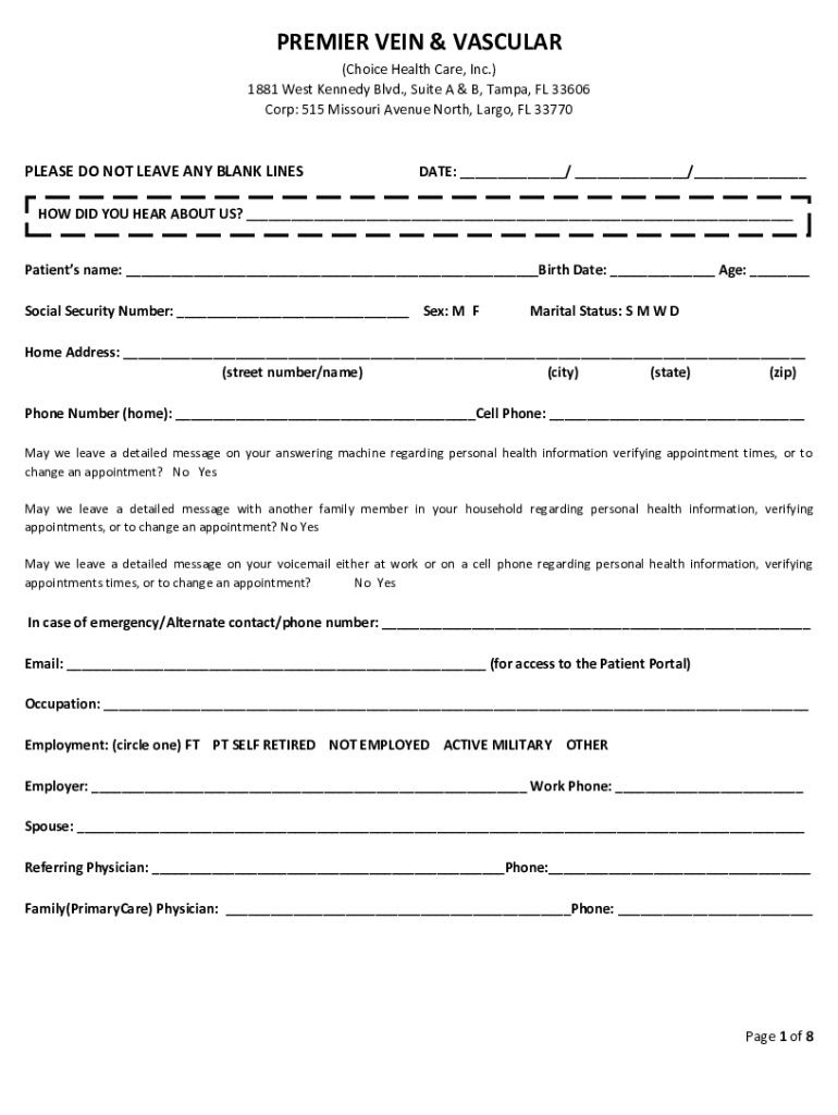 PREMIER VEIN & VASCULAR (Choice Health Care, Inc.) 1881 West Kennedy Blvd., Suite A & B, Tampa, FL 33606 Corp: 515 Missouri Avenue North, Largo, FL 33770PLEASE DO NOT LEAVE ANY BLANK LINEAGE: ___/