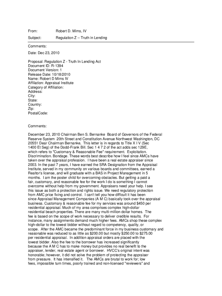 Get the free From: Robert D. Mims, IV Subject: Regulation Z -- Truth in Lending ...