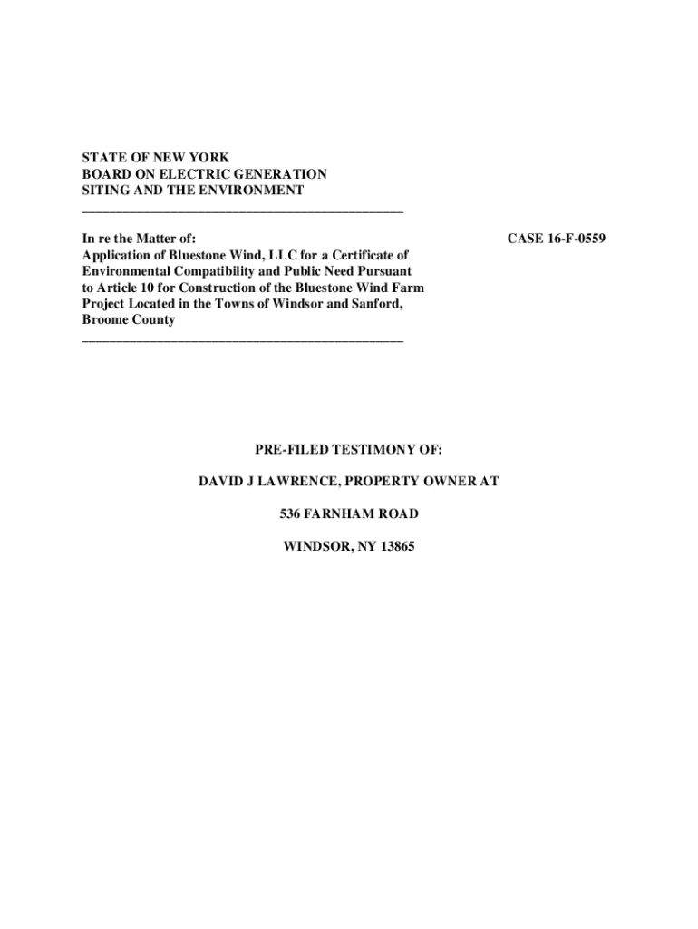 STATE OF NEW YORK Boards ON ELECTRIC GENERATION SITING AND THE ENVIRONMENT ___ In re the Matter of: Application of Blue stone Wind, LLC for a Certificate of Environmental Compatibility and Public