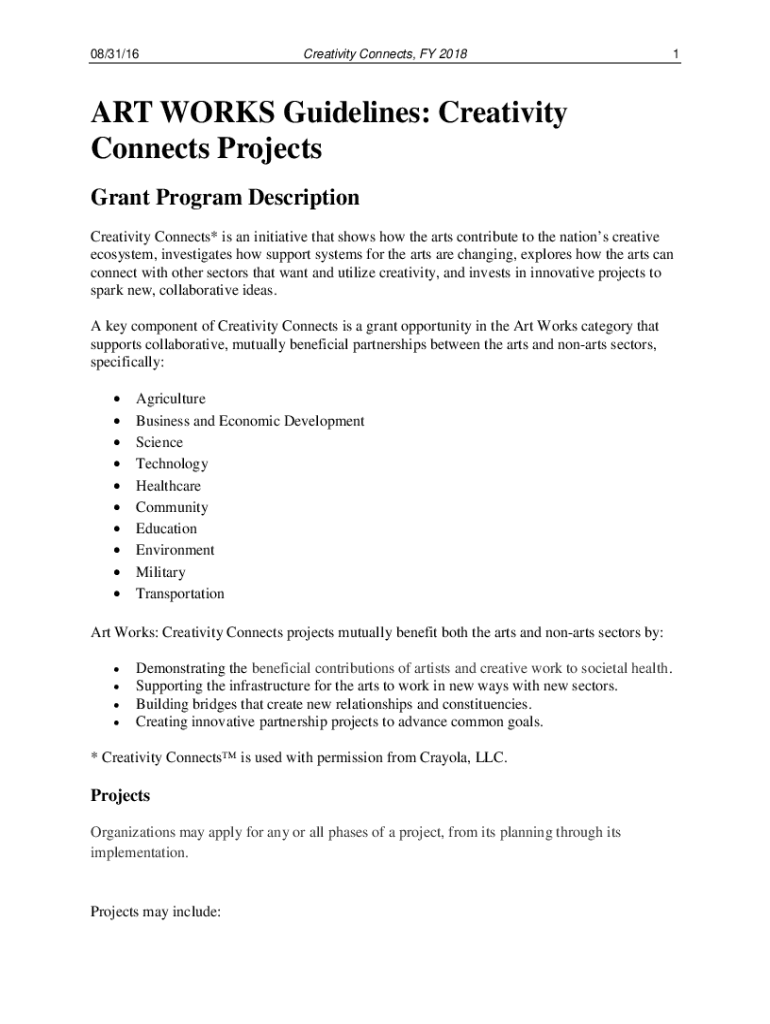 08/31/16Creativity Connects, FY 20181ART WORKS Guidelines: Creativity Connects Projects Grant Program Description Creativity Connects* is an initiative that shows how the arts contribute to the nations
