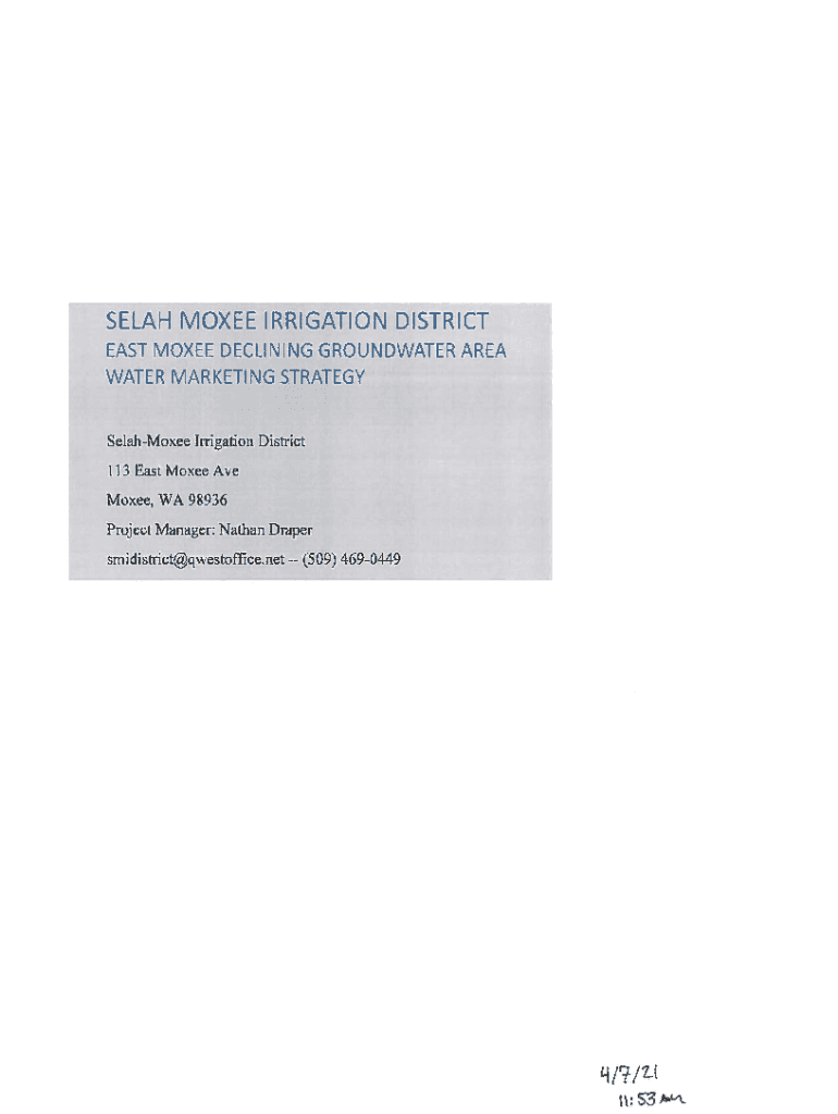 SE LAH MOXIE IRRIGATION DISTRICT EAST MOXIE DECLINING GROUNDWATER AREA WATER MARKETING STRATEGYSelahMoxee Irrigation District 113 East Moxie Ave Moxie, WA 98936 Project Manager: Nathan Draper smidistrict@qwestoffice.net