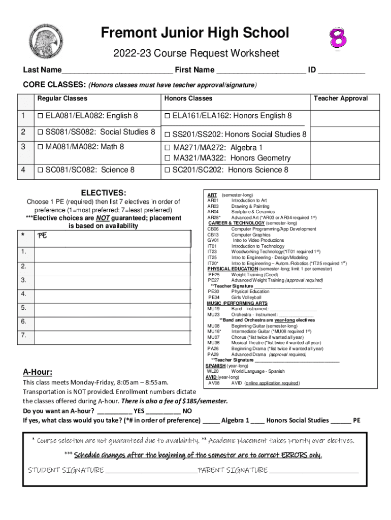 Fremont Junior High School 202223 Course Request Worksheet Last Name___ First Name ___ ID ___ CORE CLASSES: (Honors classes must have teacher approval/signature) Regular ClassesHonors Classes1 ELA081/ELA082:
