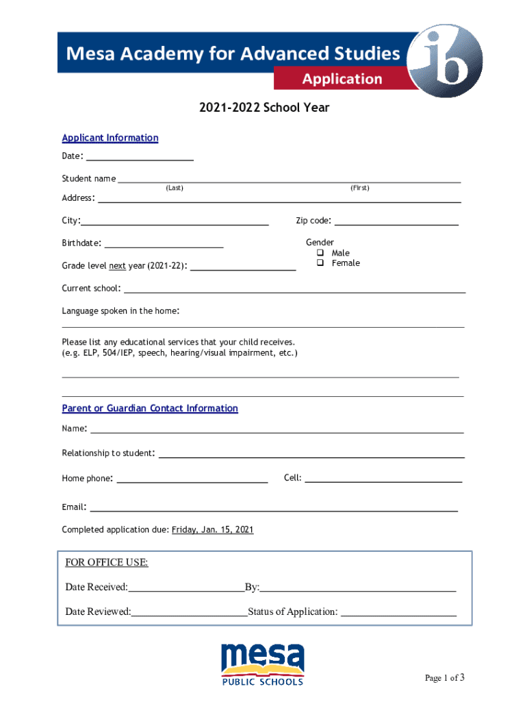 Mesa Academy for Advanced Studies Application 20212022 School Year Applicant Information Date: Student name Address:(Last)(First)City:Zip code:Birthdate:Gender Male FemaleGrade level next year (202122):