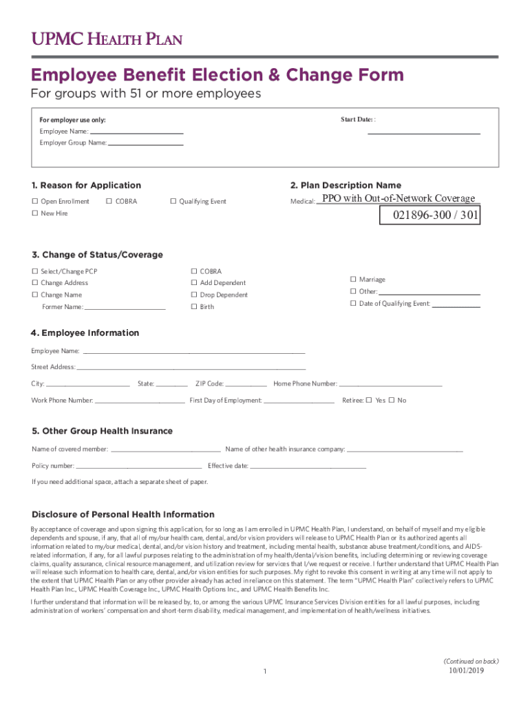 Employee Benet Election & Change Form For groups with 51 or more employees 4UBSU%BUF:For employer use only: Employee Name: Employer Group Name:1. Reason for Application Open Enrollment COBRA2. Plan