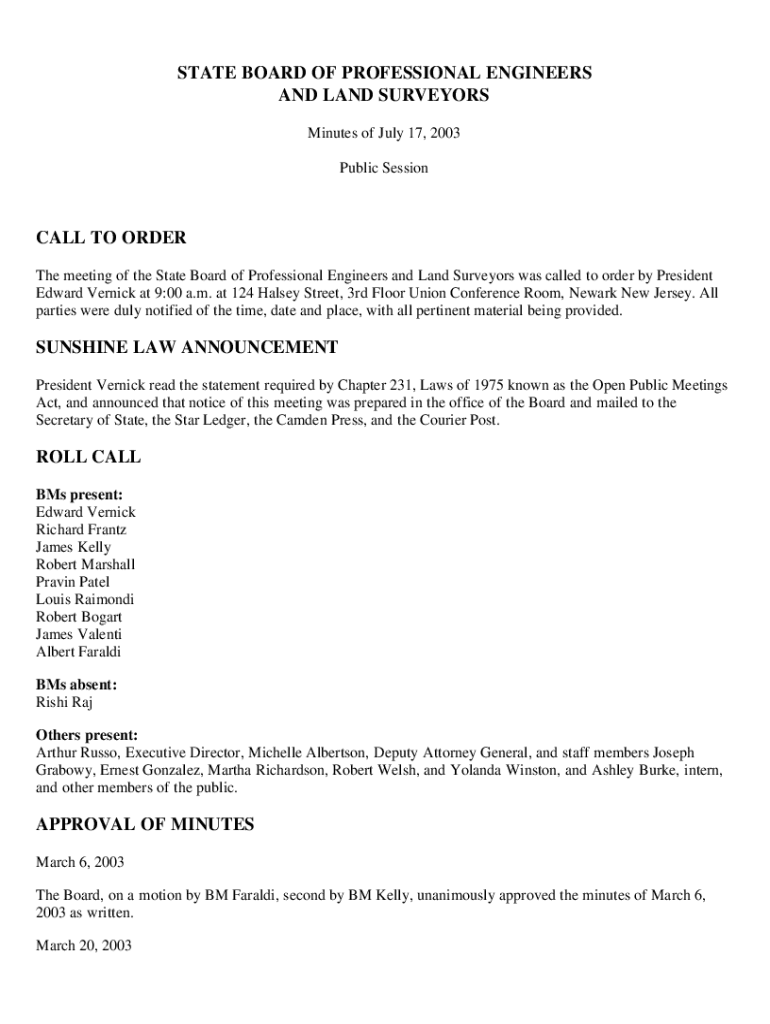 STATE BOARD OF PROFESSIONAL ENGINEERS AND LAND SURVEYORS Minutes of July 17, 2003, Public Sessional TO ORDER The meeting of the State Board of Professional Engineers and Land Surveyors was called