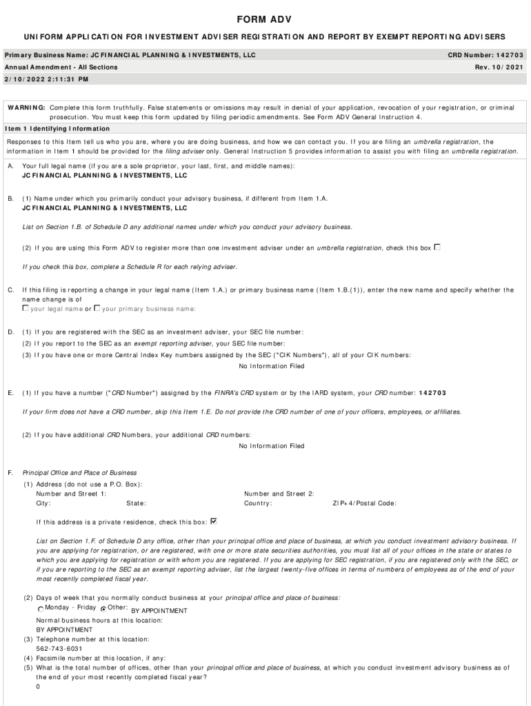 FORM ADV UNIFORM APPLICATION FOR INVESTMENT ADVISER REGISTRATION AND REPORT BY EXEMPT REPORTING ADVISERS Primary Business Name: JC FINANCIAL PLANNING & INVESTMENTS, LLC CRD Number: 142703Annual Amendment