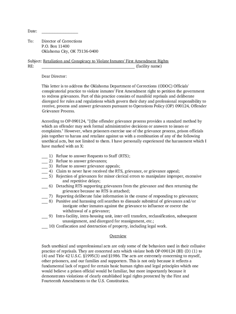 Date:___To:Director of Corrections P.O. Box 11400 Oklahoma City, OK 731360400Subject: Retaliation and Conspiracy to Violate Inmates\' First Amendment Rights RE: ___ (facility name) Dear Director: