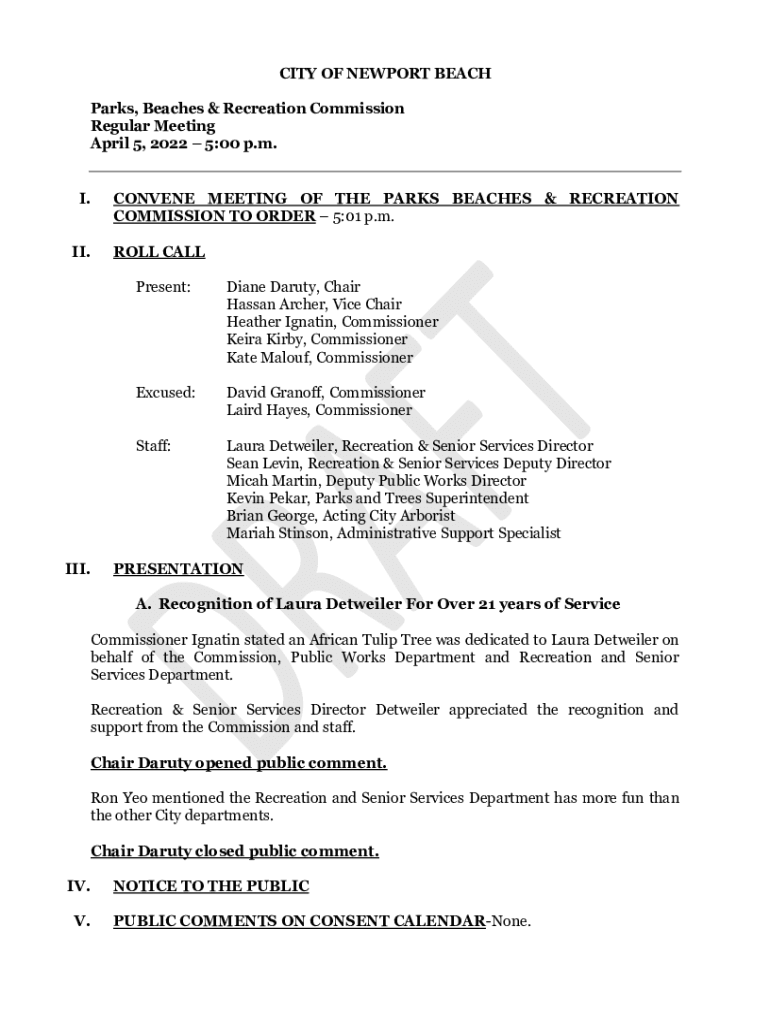 CITY OF NEWPORT BEACH Parks, Beaches & Recreation Commission Regular Meeting April 5, 2022 5:00 p.m. I. II.III.CONVENE MEETING OF THE PARKS BEACHES & RECREATION COMMISSION TO ORDER 5:01 p.m. ROLL