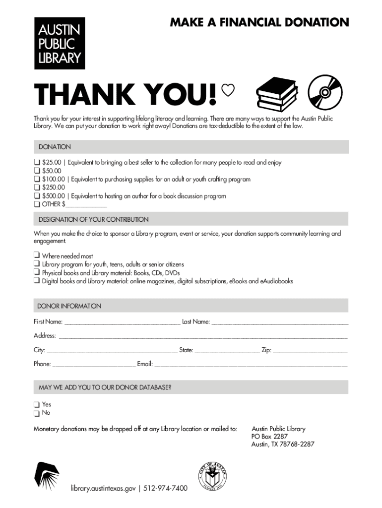MAKE A FINANCIAL DONATIONTHANK YOU! Thank you for your interest in supporting lifelong literacy and learning. There are many ways to support the Austin Public Library. We can put your donation to