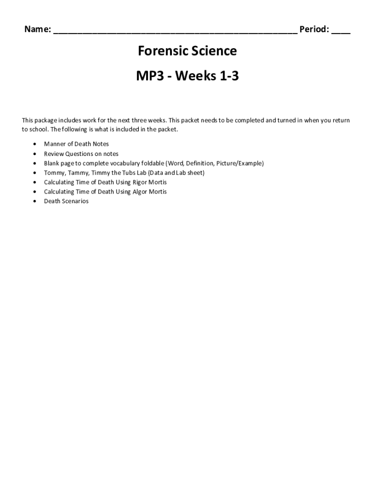 Name: ___ Period: ___Forensic Science MP3 Weeks 13 This package includes work for the next three weeks. This packet needs to be completed and turned in when you return to school. The following is