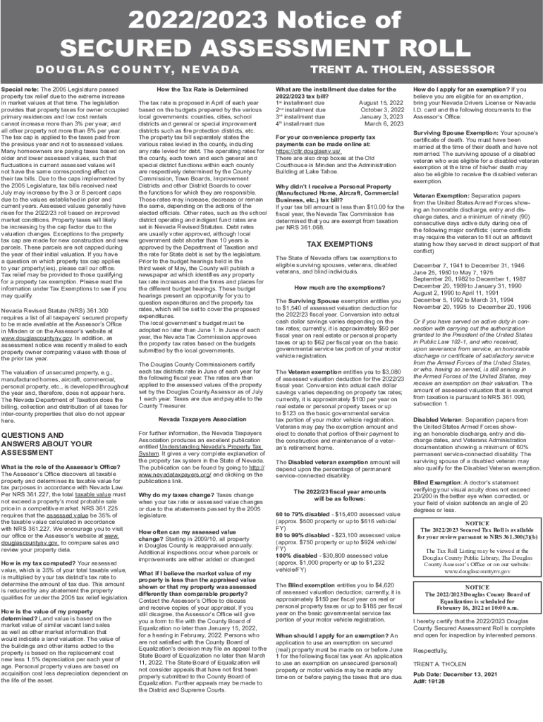 2022/2023 Notice of SECURED ASSESSMENT ROLL D O U G L A S C O U N T Y, N E VA DA Special note: The 2005 Legislature passed property tax relief due to the extreme increase in market values at that