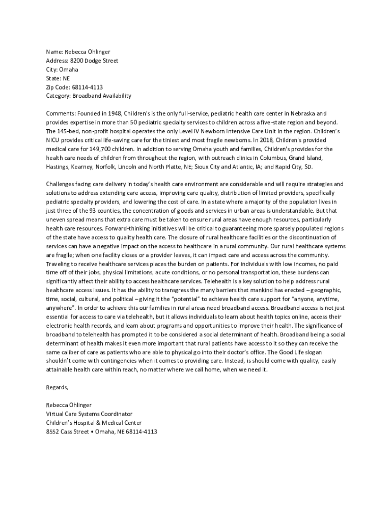 Name: Rebecca Oh linger Address: 8200 Dodge Street City: Omaha State: NE Zip Code: 681144113 Category: Broadband Availability Comments: Founded in 1948, Children\'s is the only full service, pediatric