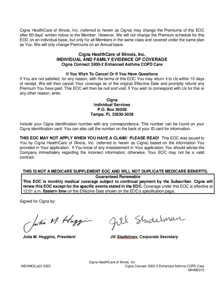 Cagney Healthcare of Illinois, Inc. (referred to herein as Cagney) may change the Premiums of this EOC after 60 days written notice to the Member. However, We will not change the Premium schedule