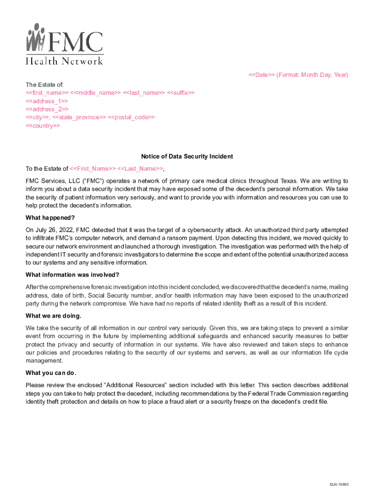 Get the free Notice of Data Security Incident To the Estate of