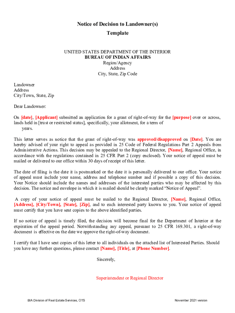 Get the free Notice of Decision to Landowner(s) Template - Indian Affairs