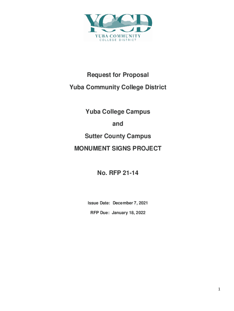 Request for Proposal Cuba Community College DistrictYuba College Campus and Sutter County Campus MONUMENT SIGNS PROJECT No. RFP 2114Issue Date: December 7, 2021, RFP Due: January 18, 20221RFP Due