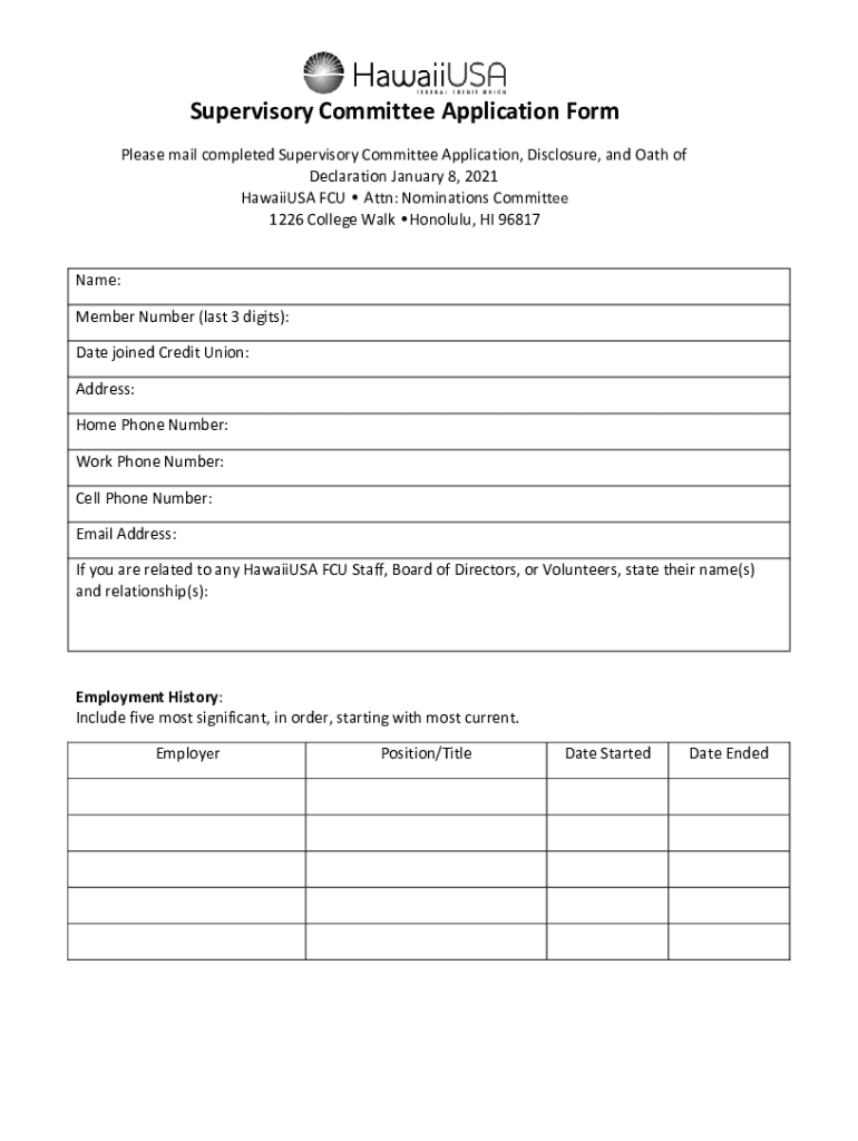 Supervisory Committee Application Form Please mail completed Supervisory Committee Application, Disclosure, and Oath of Declaration January 8, 2021, Hawaii USA FCU Attn: Nominations Committee 1226