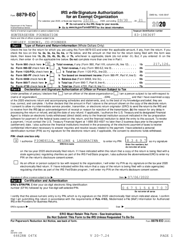 Form IRS file Signature Authorization for an Exempt Organization8879EOIFor calendar year 2020, or fiscal year beginningIDepartment of the Treasury Internal Revenue Service10/01, 2020, and ending OMB